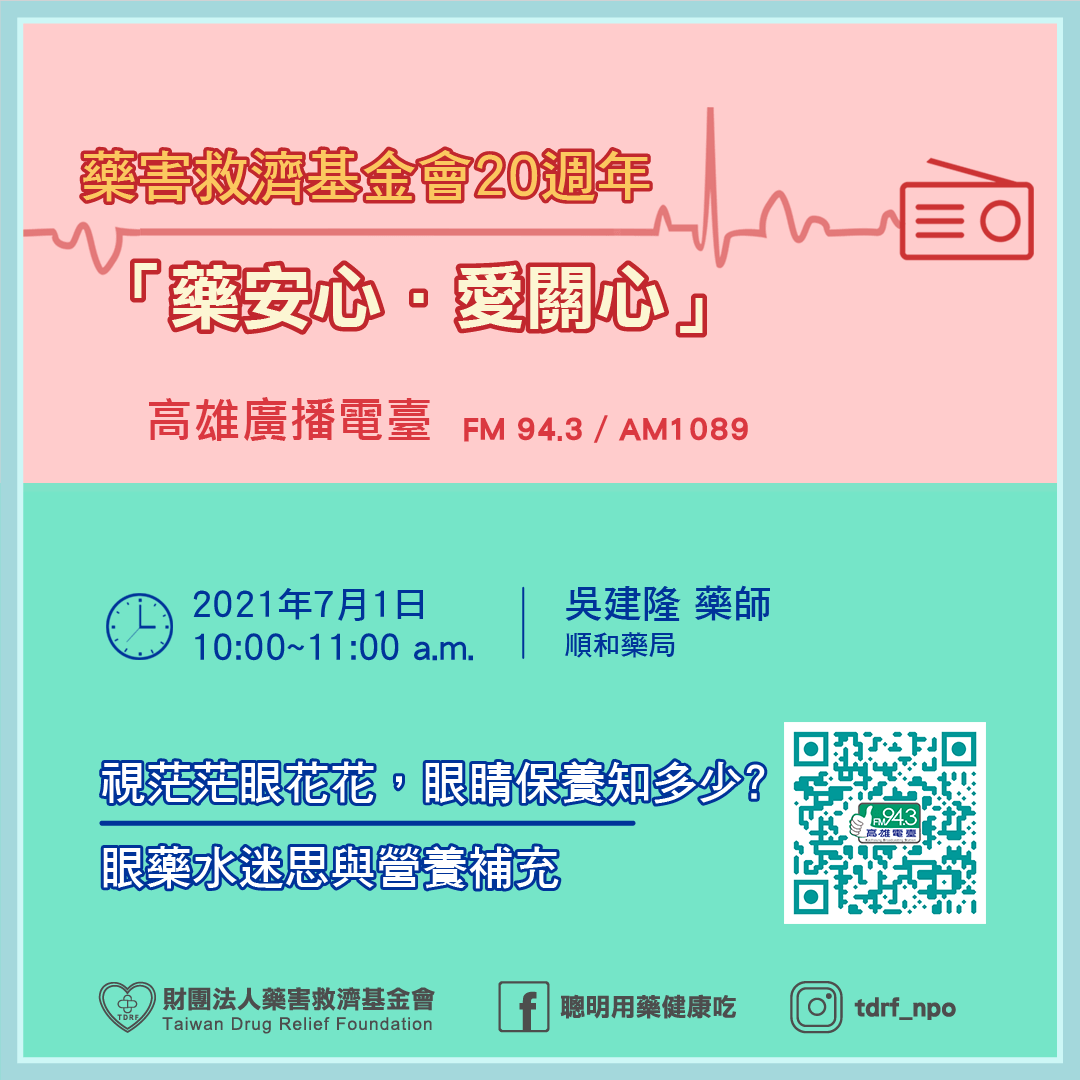 財團法人藥害救濟基金會特別邀請高雄社區藥局吳建隆藥師,於7月1日(四)早上10點在高雄廣播電台FM94.3,帶您了解長期3C不離身,眼睛會出現哪些症狀?教您如何護眼明目,提供您靈魂之窗的保養之道。